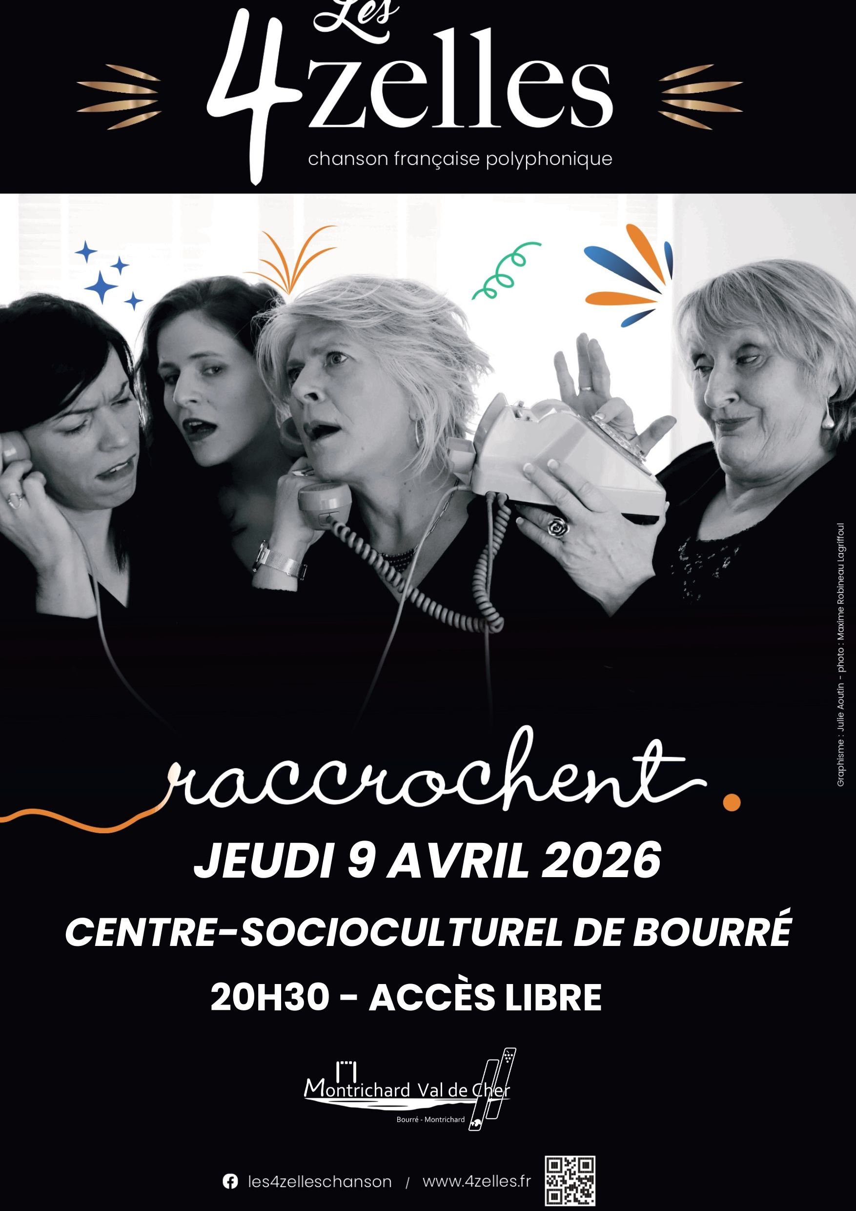 Le Centre socioculturel de Bourré accueillera le groupe Les 4zelles, formation de chanson française polyphonique, le jeudi 9 avril 2026 à 20h30.